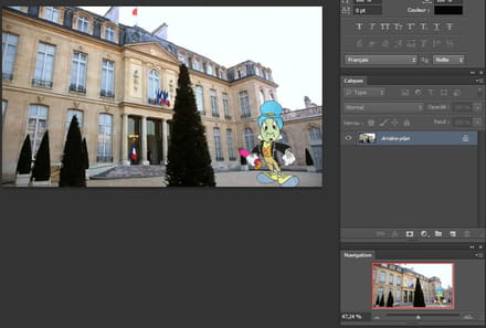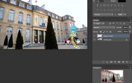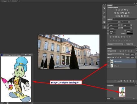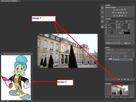 Vous m'invitez à envoyer un exemple de résultats. Mais je n'ai aucun résultat ! J'ai suivi les premiers conseils de kabakak. La première fois, la seconde image n'apparaissait pas, juste un carré transparent en bas à droite, ensuite, elle est apparue dans un petit carré en haut à droite dans la première image, mais impossible de l'en détacher.