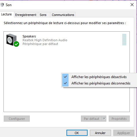clique droit sur l'icône du son dans la barre des tâches, et choisi "périphériques de lecture"