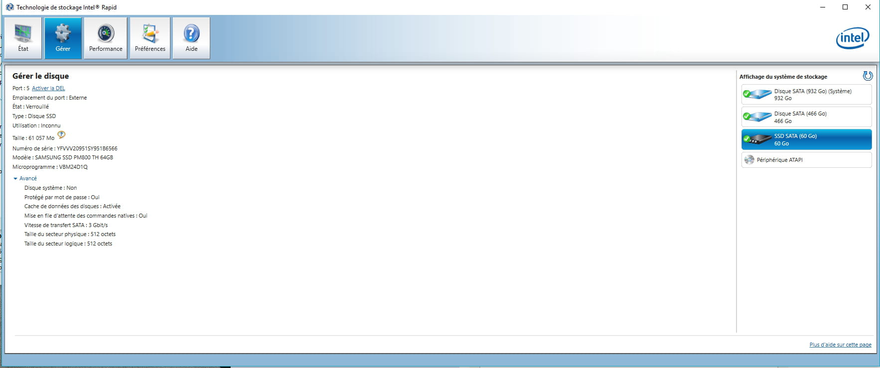 quand je débranche la prise sata du ssd ordi allumé "technologie de stockage intel Rapid" le détecte mais il est verrouillé / sécurisé par un mot de passe (voir le Screenshots)