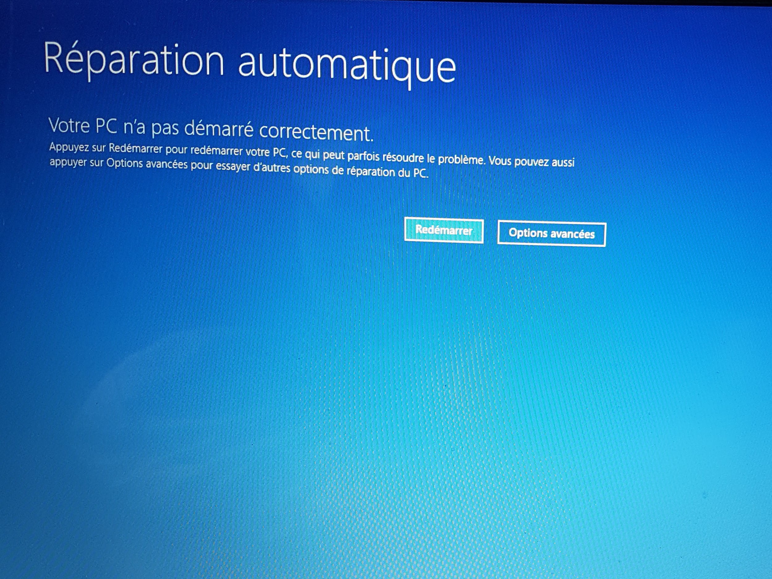 Problème : depuis, impossible de démarrer. D'abord un écran noir avec un cercle de chargement qui tourne et la phrase "Diagnostic de votre ordinateur", puis je tombe sur un écran bleu indiquant "Réparation automatique, votre PC n'a pas démarré correctement."