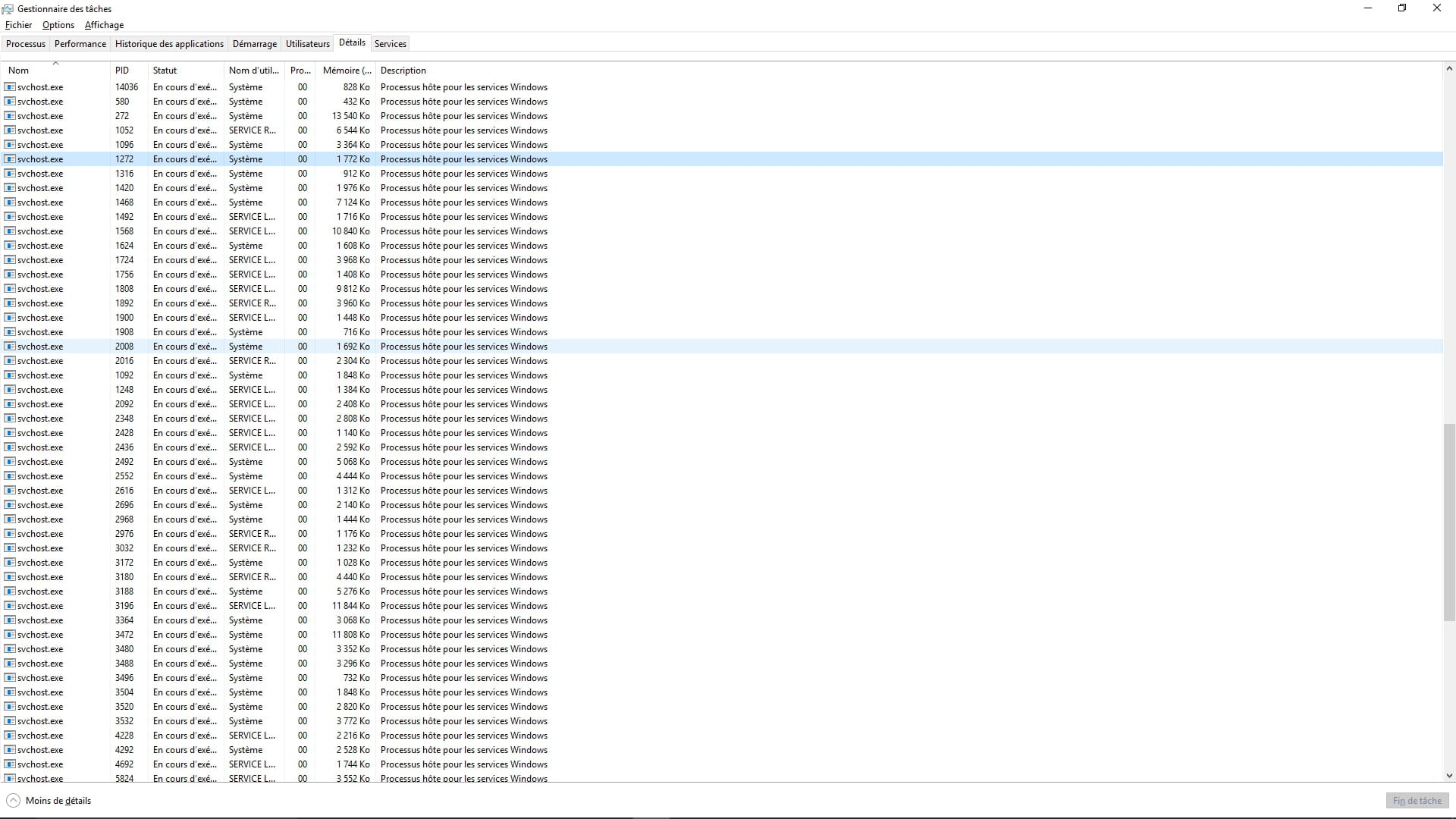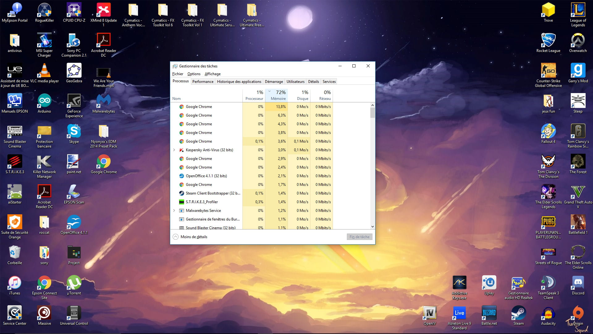cela fait un moment que j'essais de réparer le problème mais il réapparaît peu de temps après. Lors du démarrage la mémoire RAM est saturée et le reste même après et pourtant je ne lance rien d'autre en plus que d'habitude. J'avais déjà eu ce problème mais j'avais réussi a le fixer avec une mise a jour de ma carte réseau qui été resté celle de Windows 7 mais voila, après une certaine période le problème reviens. Bien évidemment j'ai déjà fais de multiples scan pour nettoyer mon pc mais rien ne fonctionne (Roguekiller,Malwairbites,antivirus orange). De plus je me demandais si c'était normal d'avoir autant de google-chromes d'ouverts alors que je n'en est ouvert qu'un ? Pareil pour les svchost.exe (qui peuvent être le problèmes d'ailleurs). Voilà je suis a bout et j'aurais vraiment besoins d'aide; Merci a tout ceux qui prendrons le temps de m'aider.