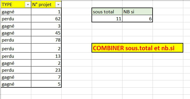Novice sur Excel j'aurai besoins de combiner la fonction SOUSTOTAL et NB.si pour que quand j'applique des filtres à mon tableau le résultat de NB.si s'adapte et me donne la valeur pour le nombre de projet "gagné".