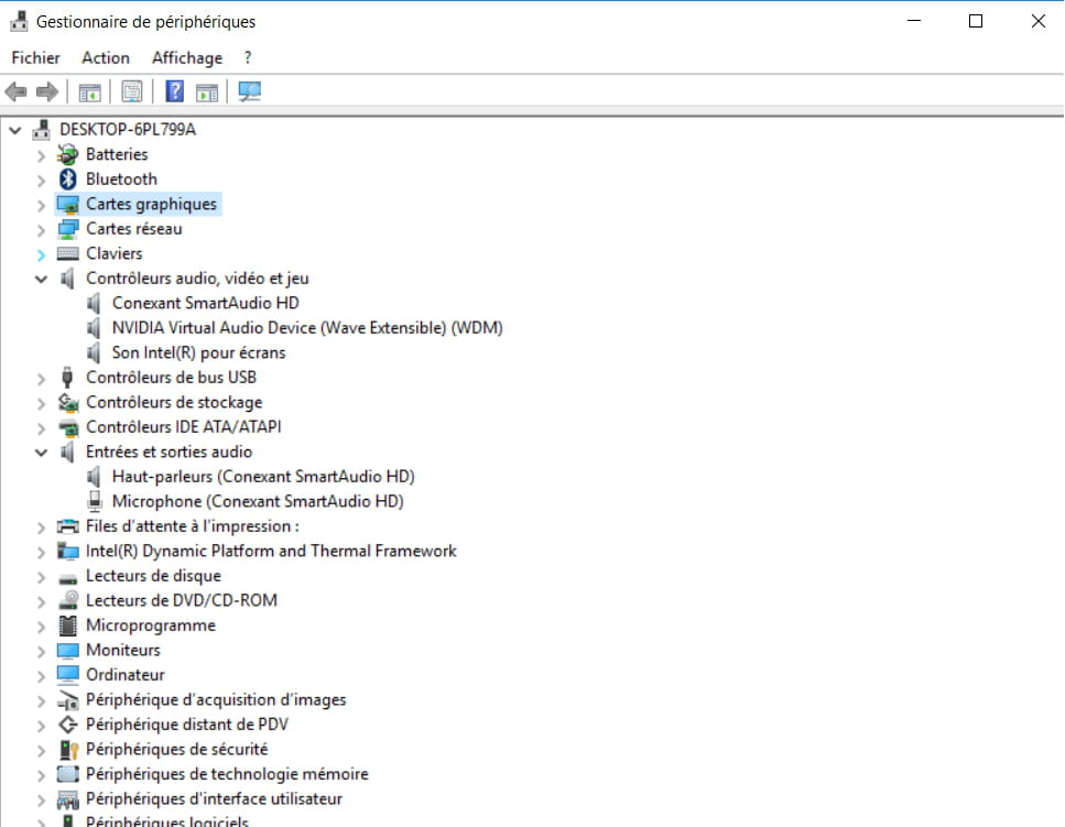 (Touche Windows + R) tu y tape devmgmt.msc et tu capture cet écran.. éventuellement, développe la partie AUDIO avec le Haut parleur.