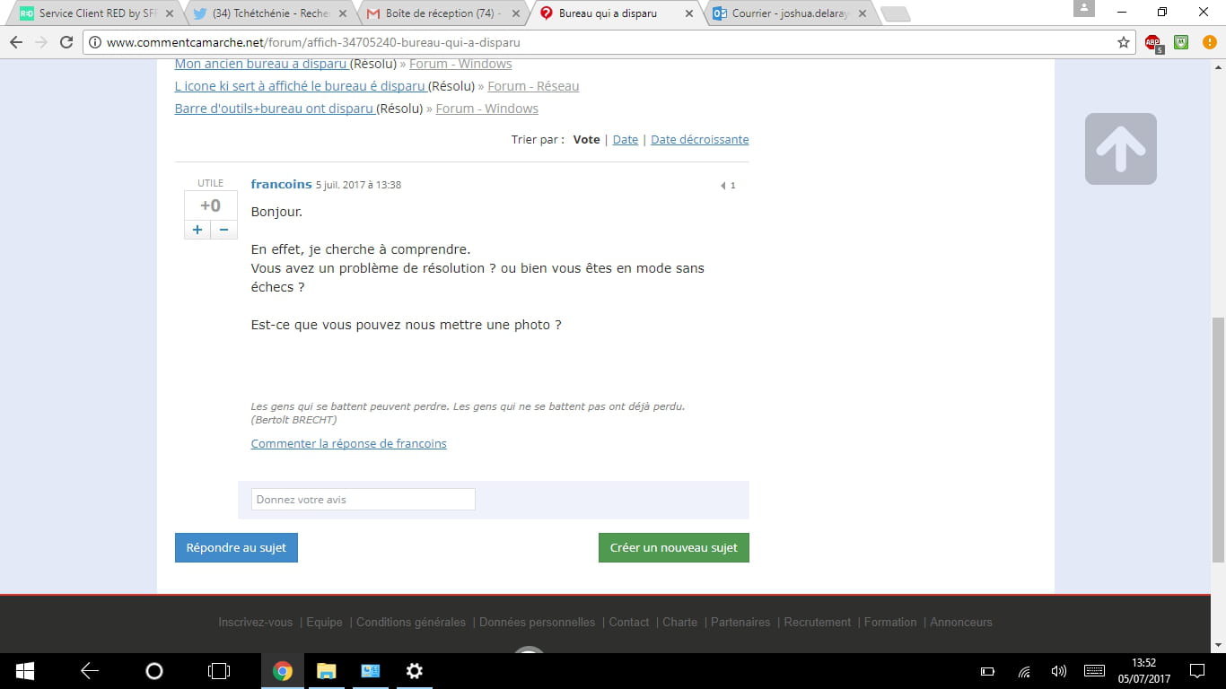 Bonjour à tous, s'il vous plaît j'ai besoin de votre savoir pour m'aider à rétablir le bureau de mon pc qui a disparu ou en tout cas je ne peux pas y avoir accès comme d'habitude en réduisant toutes mes fenêtres. De plus là barre de recherche du bas a disparu également, bref tout a changé et ça ne me convient pas du tout quand je réduis toutes les fenêtres j'arrive sur le menu démarrer mais version large, sur tout l'écran. Excusez moi si je ne suis pas clair, n'hésitez pas à me demander plus d'infos pour vous éclairer.