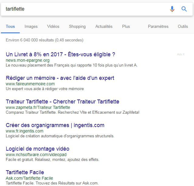 Comme on voit, on haut à droite, y'a un texte "Ads x" et quand on clique sur le "x", les 6 premiers résultats disparaissent.