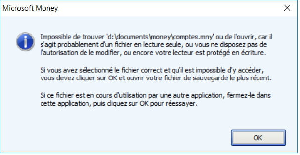 Mais quand je veux ouvrir mon fichier actuel xxxxx.mny, Money 2005 sous Win10 fait une copie du fichier, renomme l'ancien fichier xxxxx.M12 puis me dit qu'il ne trouve pas le fichier qu'il vient de créer (qui existe bien et que money 2005 lit sans soucis sur l'autre portable sous Win7). Idem si je reprends un sauvegarde (xxxx Bak.mbf).