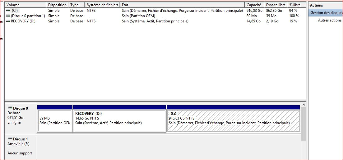 J'ai suivi les étapes et après avoir redémarré mon ordinateur , j'ai vérifié et mon disque D Recovery est encore au même pourcentage et il est demeuré actif.