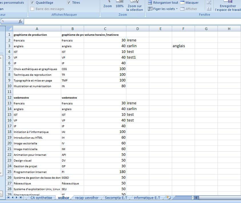 ici je souhaite faire un recap des noms d'enseignants et des matieres dans lesquelles ils interviennent .