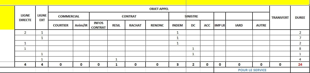 Voila mon problème. Nous devons tenir un tableau des appels téléphoniques et nous répondons autant pour notre service que pour les autres. Seules 3 colones J,K,L concernent notre service.