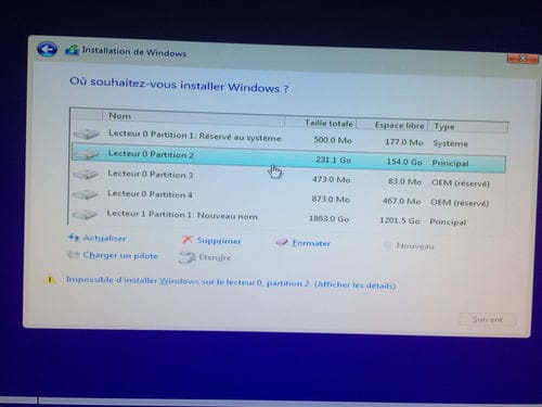 Je me demande si ce n'y pas du au fait que j'ai sélectionné une partition (le disque dur ssd samsung j'imagine) ou n'était pas installe windows. J'aurais dû sélectionner la partition 1 (voir image précédente)? Mais il me disait de mémoire qu'il n'y avait pas assez de place. Cela dit, même sur ce disque ssd samsung ou Windows est semble t il désormais installé, j'avais des dossiers que je ne retrouve pas
