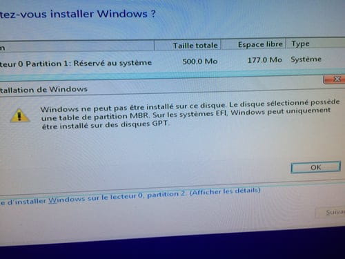 Tu vérifie dans gestion de disque si il est bien passé en gpt.
