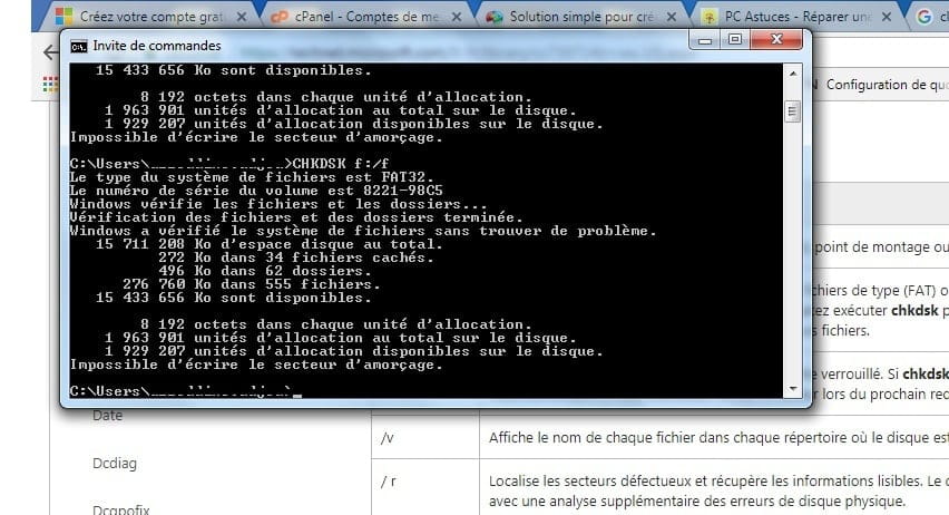 j'ai essayer tous d'abore de la réparé grâce a la commande CHKDSK mais rien voici ce qui s'affiche