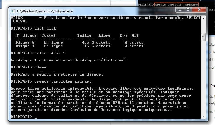 puis jai tenter de la formater avec la solution de IDSKPART mais lorsque je tape la commande create partition primary je reçois ce message d'erreur