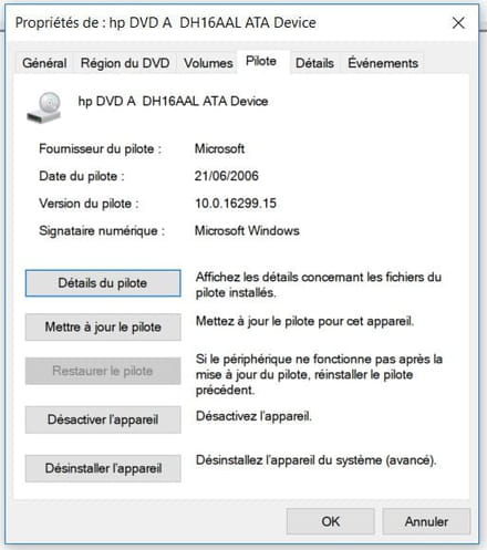 Toujours dans le gestionnaire de périphériques, cliquez droit sur le lecteur puis propriétés et sur pilote pour finir. Dans la fenêtre qui s'ouvre voyez si vous pouvez installer l'ancien pilote.