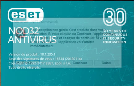 Une exception non gérée s'est produite dans votre application. Si vous cliquez sur Continuer, l'application va ignorer cette erreur et essayer de continuer. Si vous cliquez sur Quitter, l'application va s'arrêter immédiatement