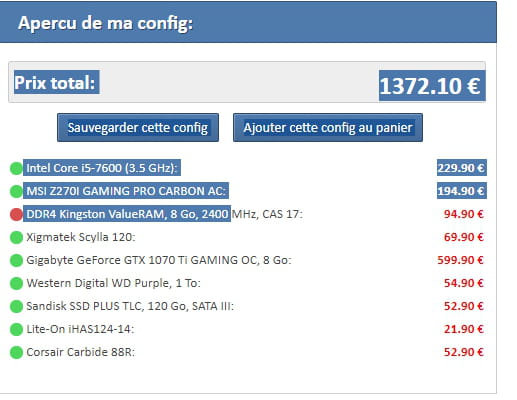 Je suppose que c'est une configuration faite sur TopAchat. Si c'est fait avec le configurateur de TopAchat, tout est compatible. Sera-t-elle automatiquement optimisée pour le budget? Pas toujours. Un peu de connaissances en hardware peuvent être utiles. On voit tout de suite la RAM. Mieux vaudrait prendre 2x4Go au lieu d'une seule barrette de 8Go pour que le système fonctionne en dual channel. De plus la barrette n'est pas disponible. Je vais essayer de proposer quelque chose meilleur pour un budget de 1400€. N'as-tu pas besoin d'alimentation? Voici un exemple, sans alimentation: