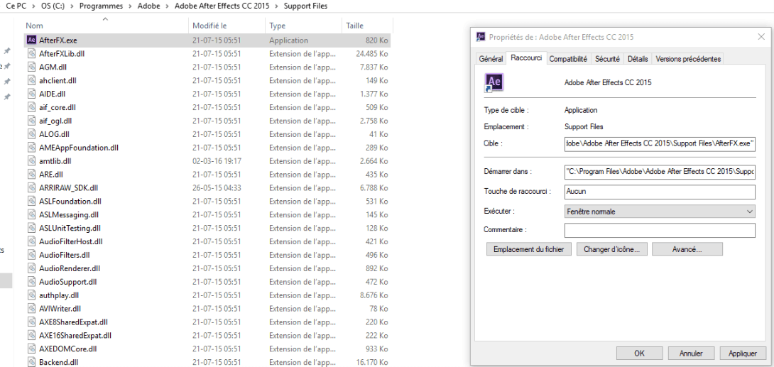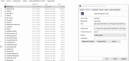 En revanche, si je prends un raccourci qui provient du dossier dans lequel je veux me rendre (toujours le dossier "Adobe" pour exemple), je peux y accéder en cliquant sur "Emplacement du fichier" dans ses propriétés :