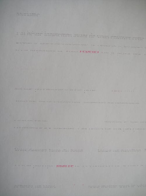 suis étonné que tu me dises de ne rien voir. Je contrôle et mon envoi est correct. De toutes les façons c'est à peine visible. J'avais inséré la photo dans "insérer" une image. On distingue des impressions et parfois en rouge.