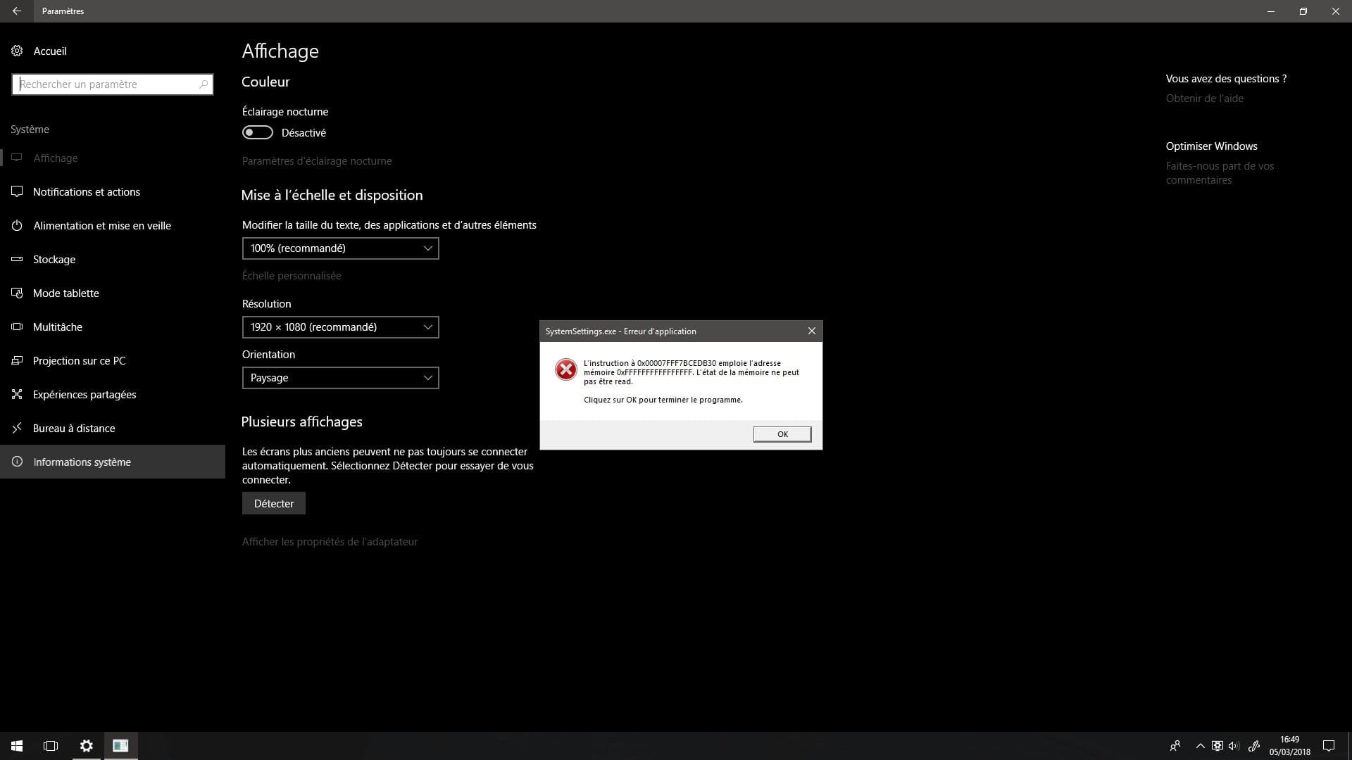 Je décide donc d'aller voir dans mes information système pour voir si tout était bien reconnu et la ce premier message d'erreur apparaît ce qui est mauvais signe je présume ( voir photo 3) je décide de recommencer et après 2-3 tentative je réussis à accéder à la partie.Mais mon CPU n'est pas reconnue (voir photo 4), je démarre donc le gestionnaire de tâche et la tout est présent donc rien d'alarmant je lance un jeu au hasard et tout fonctionne parfaitement.