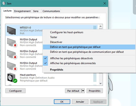 Pour que le son suive il faut aller dans les Périphériques de lecture et mettre la TV en temps que périphérique par défaut.