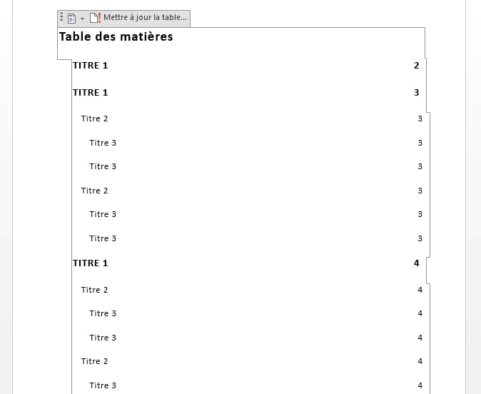 Les éléments d'une table des matières sont soumis à des styles comme pour n'importe quel paragraphe dans Word. Ces styles se nomment TM1, TM2, TM3, etc.