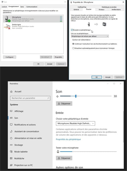 Si je continue dans "Propriété" du microphone > Onglet "Ecouter" > Coche "Ecouter ce périphérique" + "Appliquer"