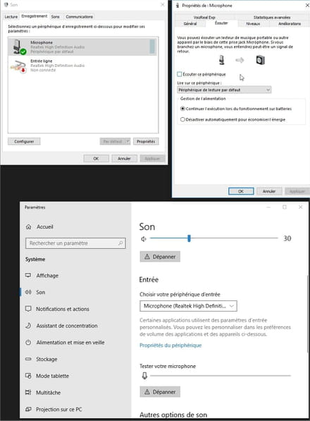 Depuis quelques jours mon micro ne fonctionne plus dans les applis type Discord ou GTalk alors que j'arrive m'entendre quand j'active la fonction "écouter ce périphérique" via les menus Windows. J'ai tenté plusieurs installation / réinstallation de drivers mais sans succès jusque là donc je demander de l'aide pour trouver ce que j'ai pu rater. Merci d'avance pour votre aide !