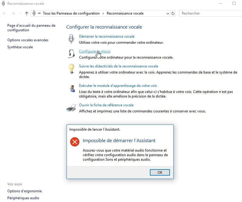 Autre symptôme qui n'a peut être aucun rapport: quand je tente de lancer l'assistant de configuration du micro, ca veut pas non plus