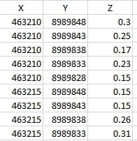 Mes trois colonnes A, B et C, representant mescoordonnees geographiques X,Y,Z.