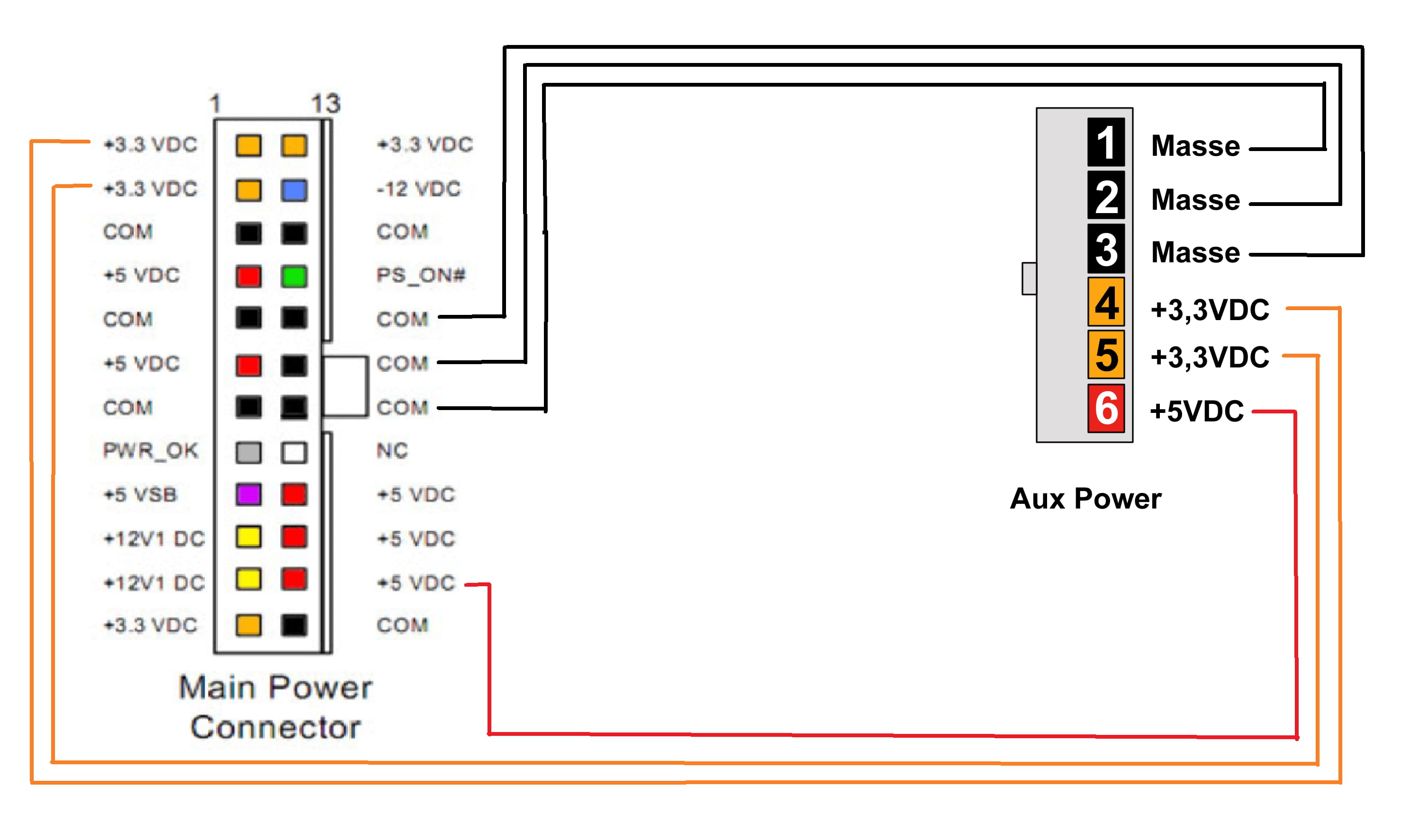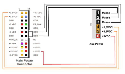 J'ai une alim TRITECH ATX - 300 qui comporte une fiche 6 broches avec 3 fils noirs, 2 fils orange et 1 fil rouge en ligne avec le rouge en 1.