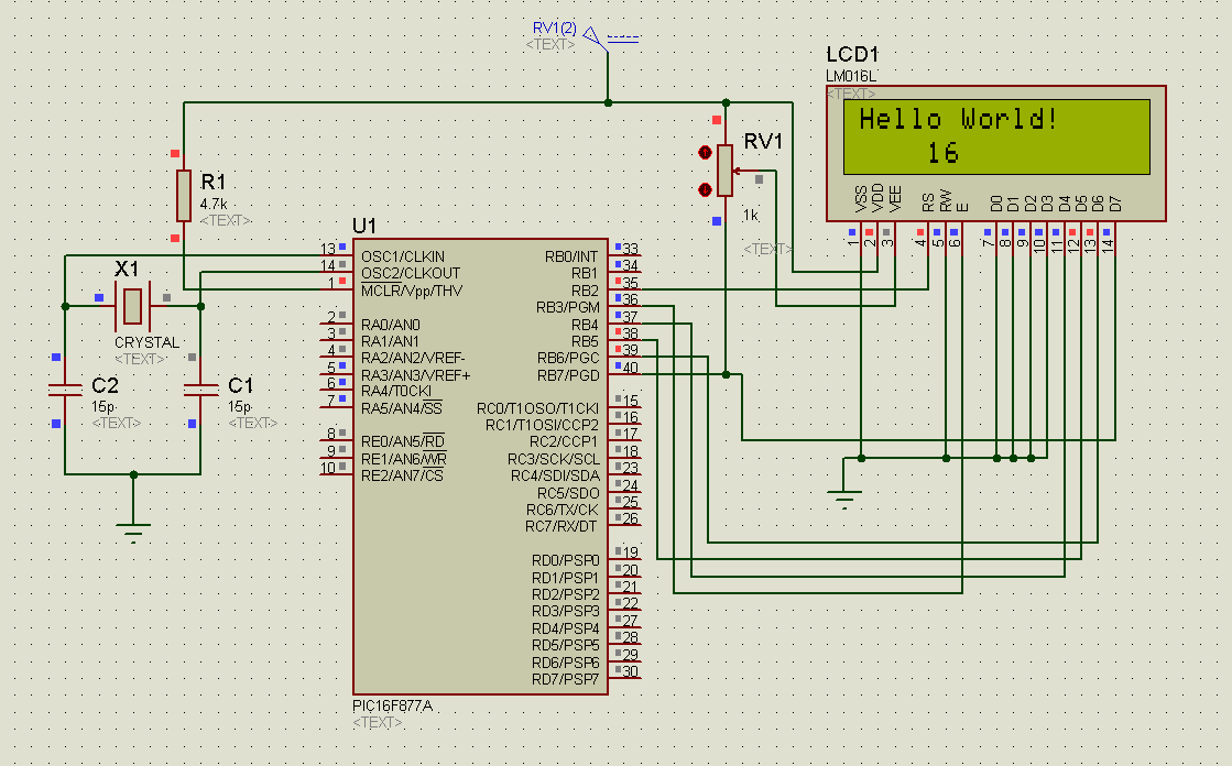 SVP aider moi j'ai mis mon pic 16F877A et j l'ai alimenté avec 5v et un afficheur LCD LM016L