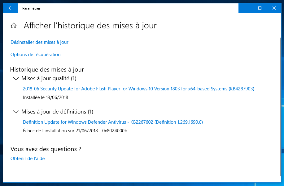 Je suis sous Windows 10 Pro en 64 bits avec cet historique de mise à jour Windows: