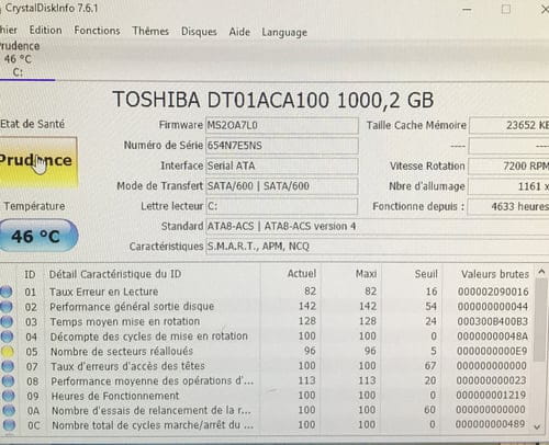 Teste ton disque dur avec CrystalDiskInfo sert-toi des codes couleur qui suivent pour interpréter les résultats, clique sur l'image pour l'agrandir :