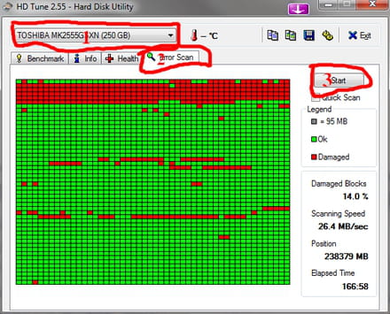 Une fois téléchargé et installé lances-le, et réfères-toi à l'image ci-dessous. Les points rouges sont des secteurs morts.
