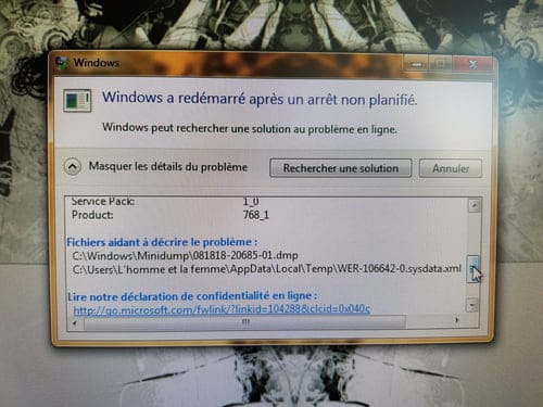 Le pc redémarre, je retente la même chose et j'obtiens le même résultat.