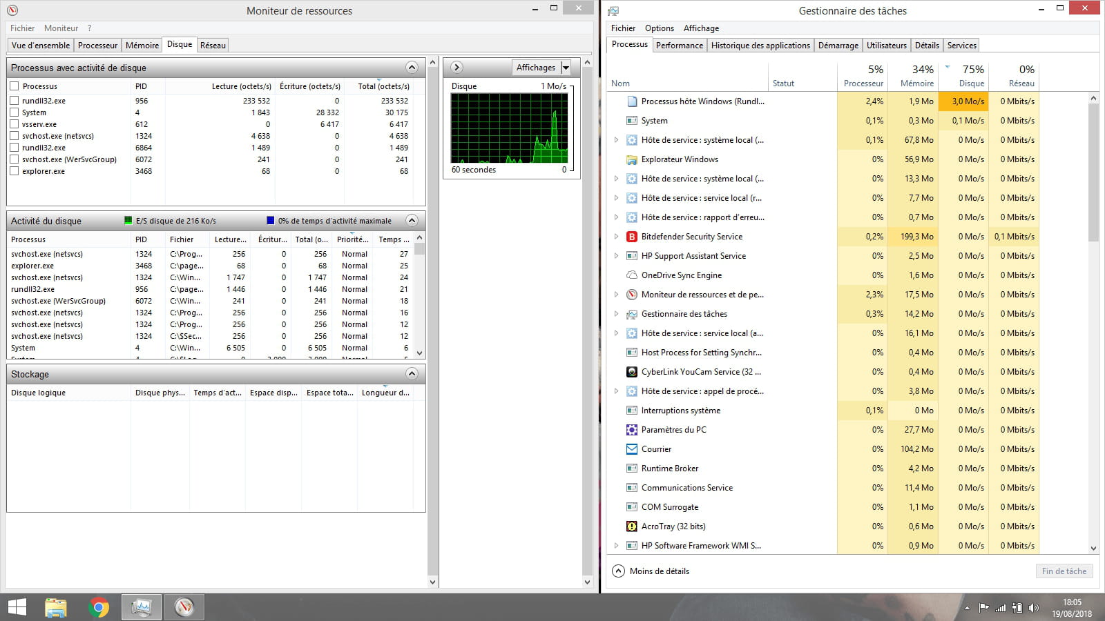 Voilà le problème : récemment, on a détecté une utilisation du disque qui monte souvent à 100% sans raison. Le problème survient de manière totalement aléatoire.