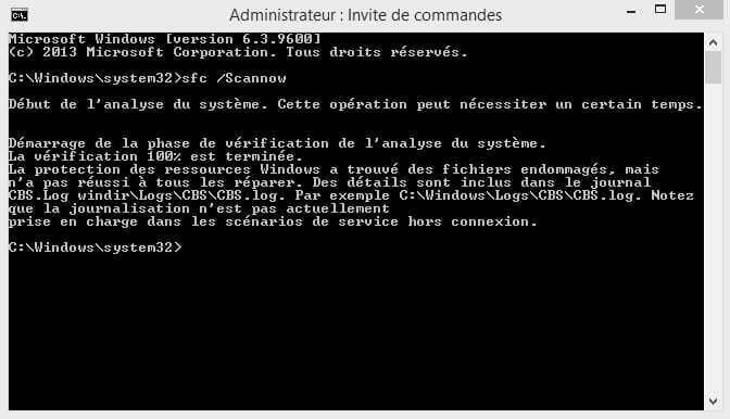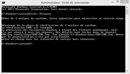 il va analyser le système et corrige les erreurs s'il en trouve, s'il te demande de redémarrer à la fin fait le, puis re-ouvre le cmd (toujours en admin) et tape: