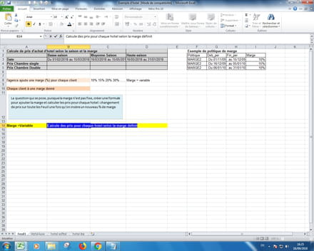 Bonjour, merci pour ta réponse, je t'explique pour mieux comprendre, La question qui se pose, puisque la marge n'est pas fixe (pour chaque client une marge différente), créer une formule pour ajouter la marge au différents prix de chaque hôtel et calculer les prix pour chacun , cela doit générer un changement de prix sur toute les Feuils une fois qu'on insère un nouveau % de marge ...