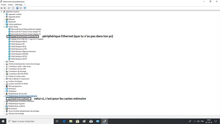 tu as juste le périphérique Wifi dans carte reseau, il manque le périphérique Ethernet
