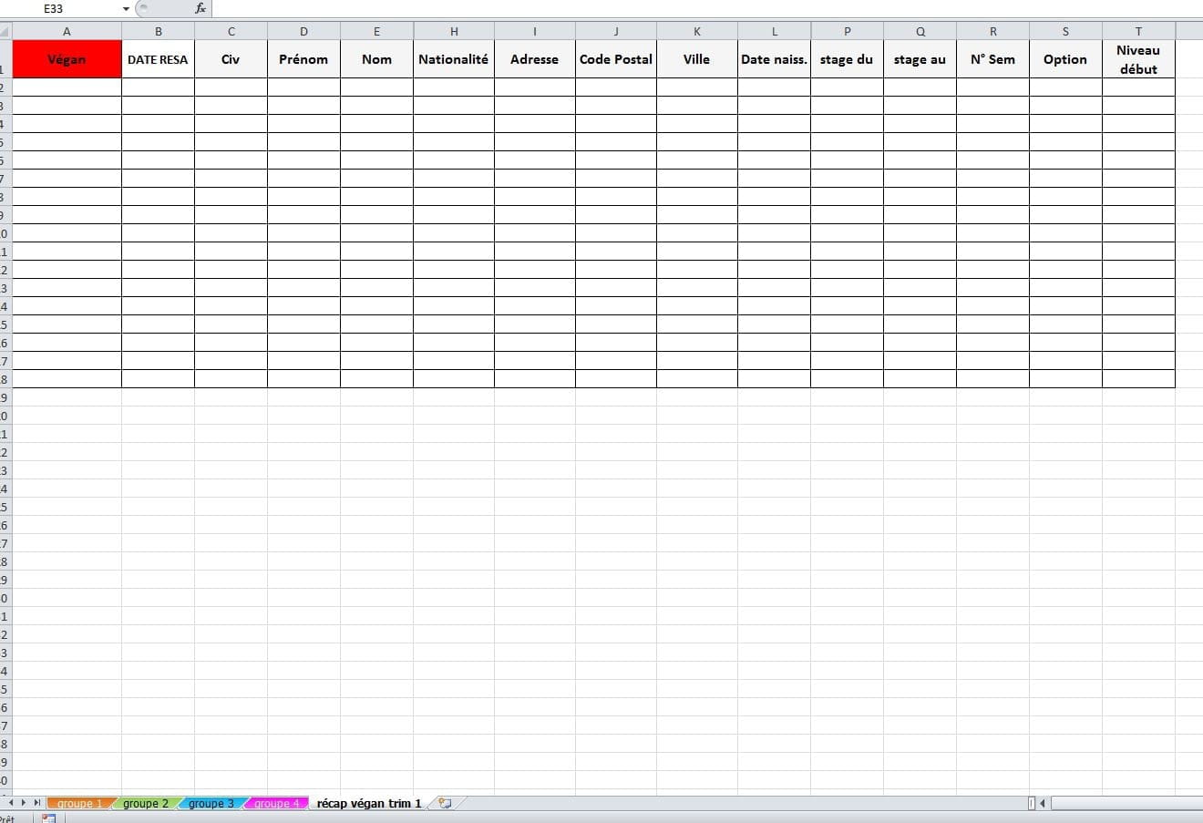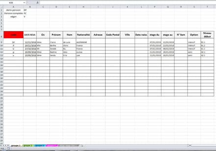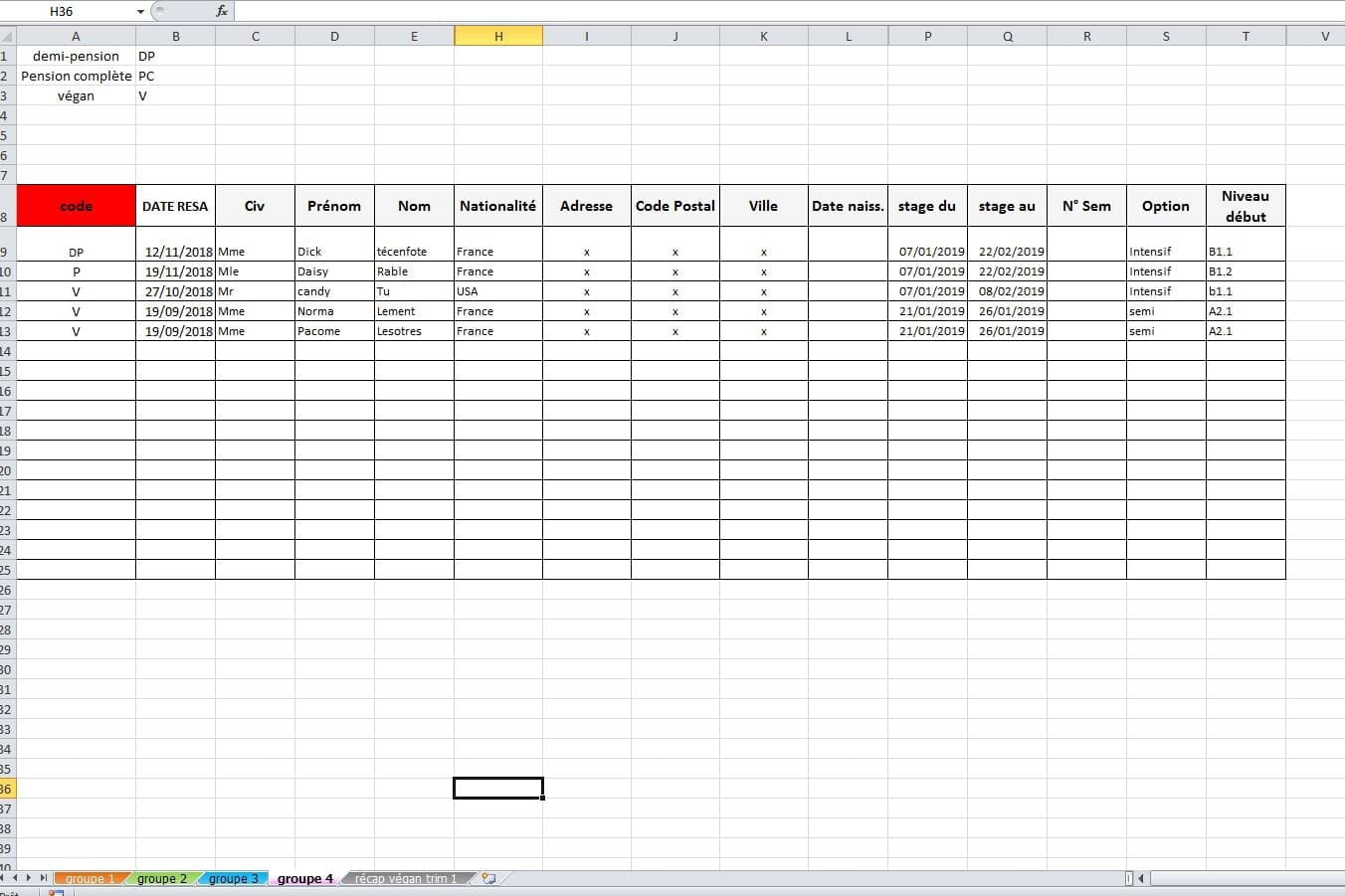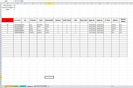 j'ai plusieurs feuilles de groupes constitués de personnes participant à des stages avec dans une colonne une lettre désignant s'ils sont demi-pensionnaires, pensionnaires et/ou végan