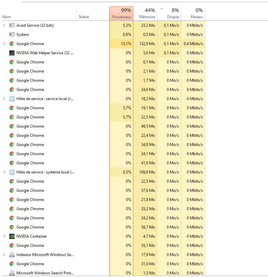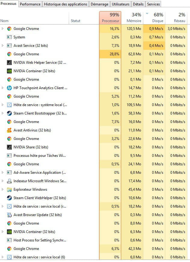 En regardant de plus près, j'ai vu que mon processeur et mon disque étaient utilisés à 100%, lorsque j'ouvrais n'importe quoi (explorateur de fichiers, chrome ou encore un jeu).