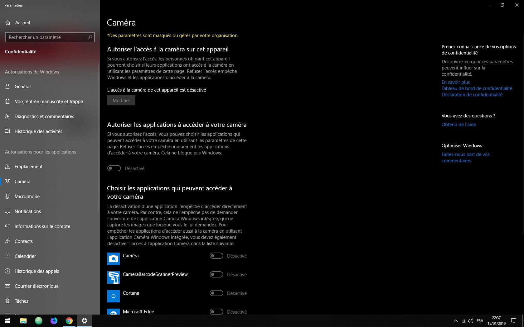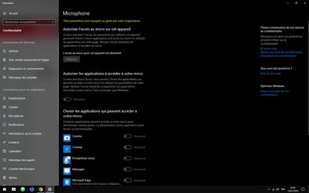 Je vais donc vérifier mes paramètres (démarrer<paramètres<barre de recherche "micro"<confidentialité du micro) et tout est désactivé et grisé ce qui m'empêche de les réactivés je vais dans l'onglet supérieur ''caméra" : IDEM, cela va faire une heure que je recherche une solution ,rien à faire ,j'ai l'impression d'être le seul à avoir ce problème là.