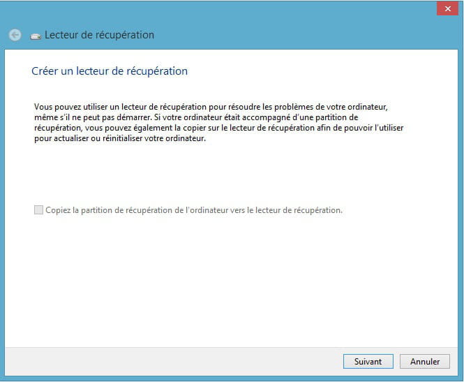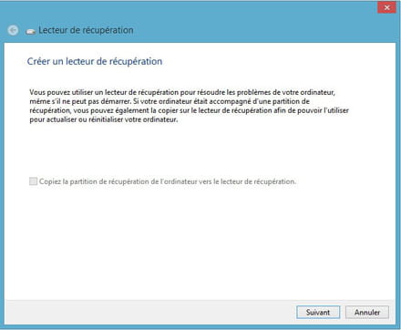Sur cet écran il est possible de copier la partition de récupération en même temps que l'on fait le lecteur de récupération.