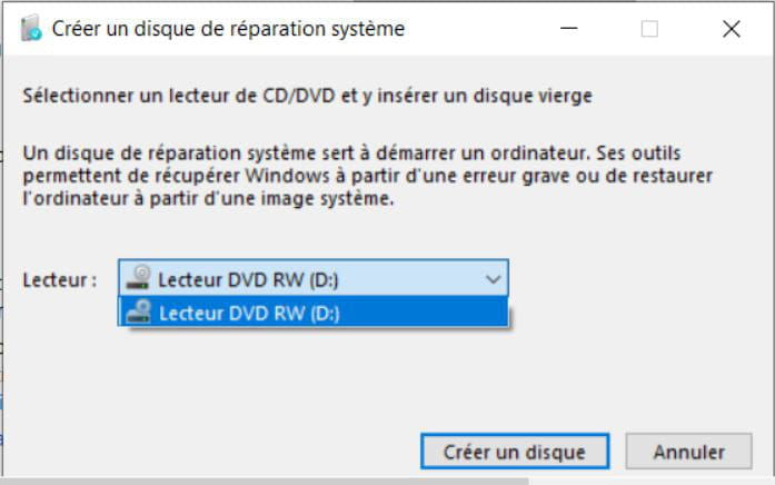 Quand a créer un disque de réparation sur clé USB perso je n'ai pas cette option sur Windows 10, ni sur Windows 7. Juste sur CD