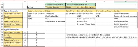 J'ai recommencé la même opération pour ma deuxième catégorie " type de document" selon la même formule mais en adaptant bien les sources de cellules et lorsque je choisis les types de document Donation ou Décès en E22 la liste déroulante qui apparaît en F22 n'est pas la bonne (je me retrouve avec la liste déroulante correspondant au type de document "cession de créance)....