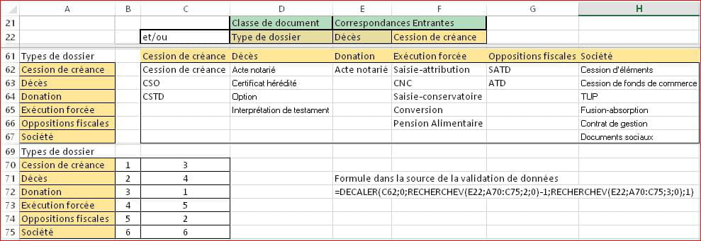 La méthode fonctionne bien pour ma première catégorie "classe de document" : les listes déroulantes en F21 apparaissent selon le choix effectué en E21 (formule dans F21 : =DECALER(C40;0;RECHERCHEV(E21;A53:C57;2)-1;RECHERCHEV(E21;A53:C57;3);1) ).