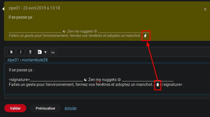 Et là, j'ai beau essayé de le remettre dans mon profil, copier/coller ou code hashteumeuleu (🐧 = 🐧), j'ai rien d’apparent en html et des ???? en copier/coller ;-\