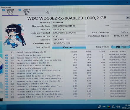 -une vérif avec crystaldiskinfo du disque dur de mon PC portable, depuis lequel je téléchage l'iso de windows, et là encore pas de soucis.