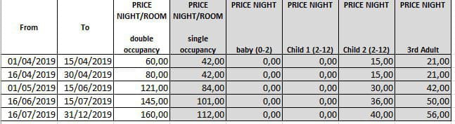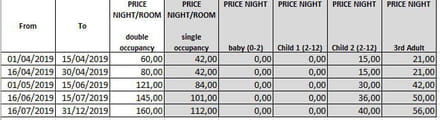 Voila j'ai un tableau de prix (nuits d'hôtels) qui dépend de périodes de voyage. Example ci dessous. Il y a donc la période de, la période à, le prix de la chambre par nuit dans la période, et différents prix selon le type de voyageurs (avec enfants, seuls, 3eme adulte dans la chambre....)