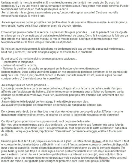 Vraiment une sacré coïncidence alors que cela soit arrivé à une poignée de personnes lors de la mise à jour de leur Huawei, et cela depuis le mois de mai.